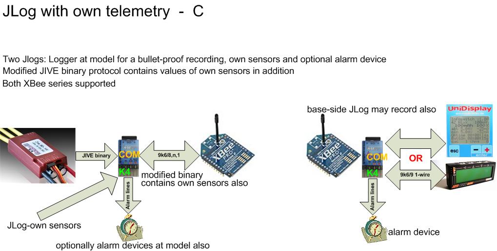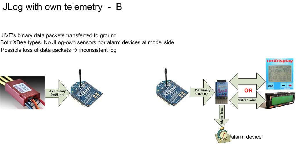 Rein technisch am besten, weil am flexibelsten, wäre es, eben auf beiden Seiten einen Microcontroller zu haben, den wir benutzen können (in der Hand haben), also sinnvollerweise einen JLog oben und einen unten, Firmware und JLC dafür aufgebohrt. Der JLog oben loggt, damit ist maximale Sicherheit für das Log gegeben. Er sendet dann als Livestream das Binärprotokoll des JIVE, ergänzt um Daten der JLog-eigenen Sensoren. Die Alarme bildet der Logger am Boden und gibt sie über seine Alarmleitungen an einen geeigneten Alarmgeber. Er kann zusätzlich auch loggen, muss es aber nicht (ohne SD, die Firmware muss diese Betriebsweise dann unterstützen). Als Display kommt somit auch eine JETIbox in Frage, oder eben zukünftig alternativ das Unidisplay. Hier wären auch XBees der Serie 2 verwendbar (XBee Pro ZB), weil “Line Passing” nicht gebraucht wird. – Ja, Leute, ich bin mir leider ziemlich sicher, dass Ihr das nicht mögen würdet, des Geldes wegen..;)