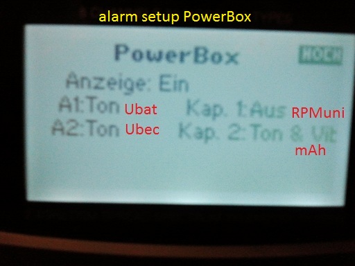 Die Alarme auf Ubat, Ubec (Dipalarm) und mAh werden in JLC gesetzt, im Sender werden die Alarme nur freigegeben und der Alarmtyp gewählt. Im Sender können keine Alarmschwellen gewählt werden.